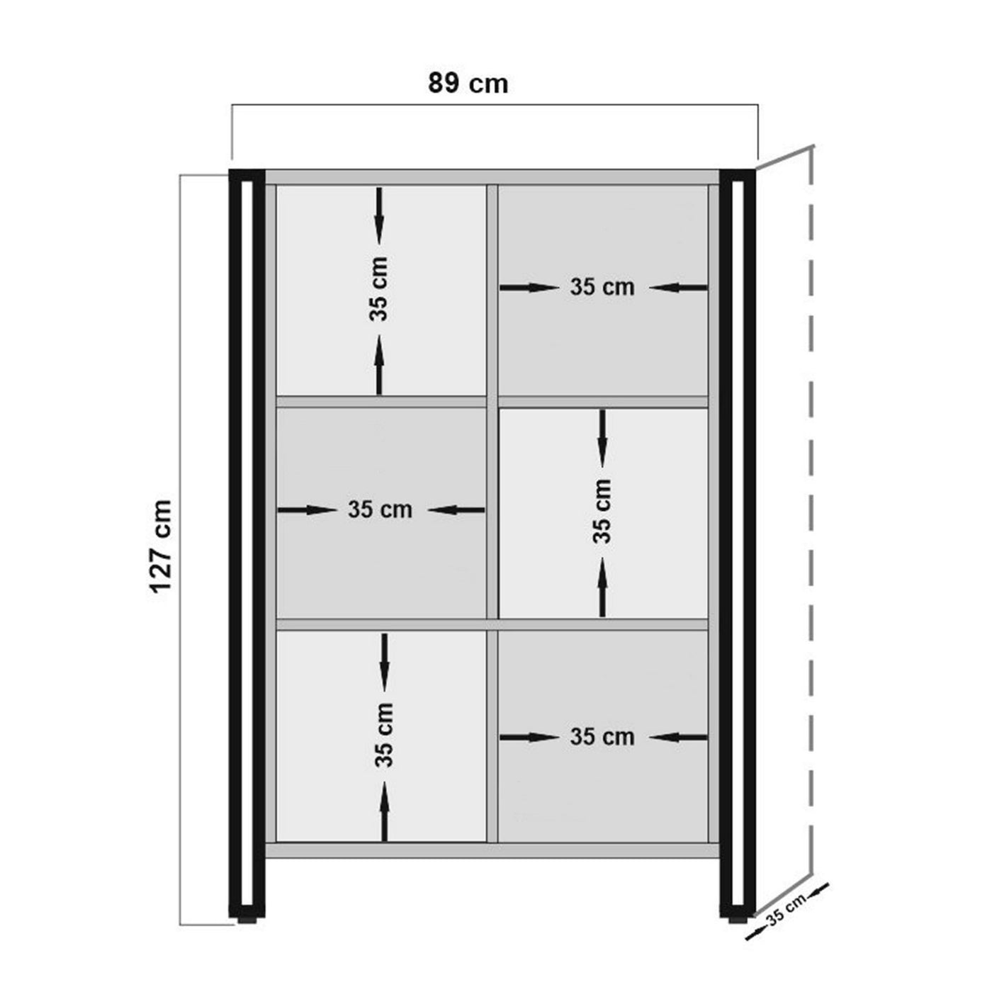 Carte de particules à revêtement en mélamine 100%Épaisseur: 18 mmArmature en métalPoignées métalliquesTaille: Largeur: 89 cm Hauteur: 127 cm de profondeur: 35 cmTaille de l'étagère: Largeur: 35 cm Hauteur: 35 cm de profondeur: 35 cmDe nombreuses étagèresPeut être fixé au murStockage supplémentaire