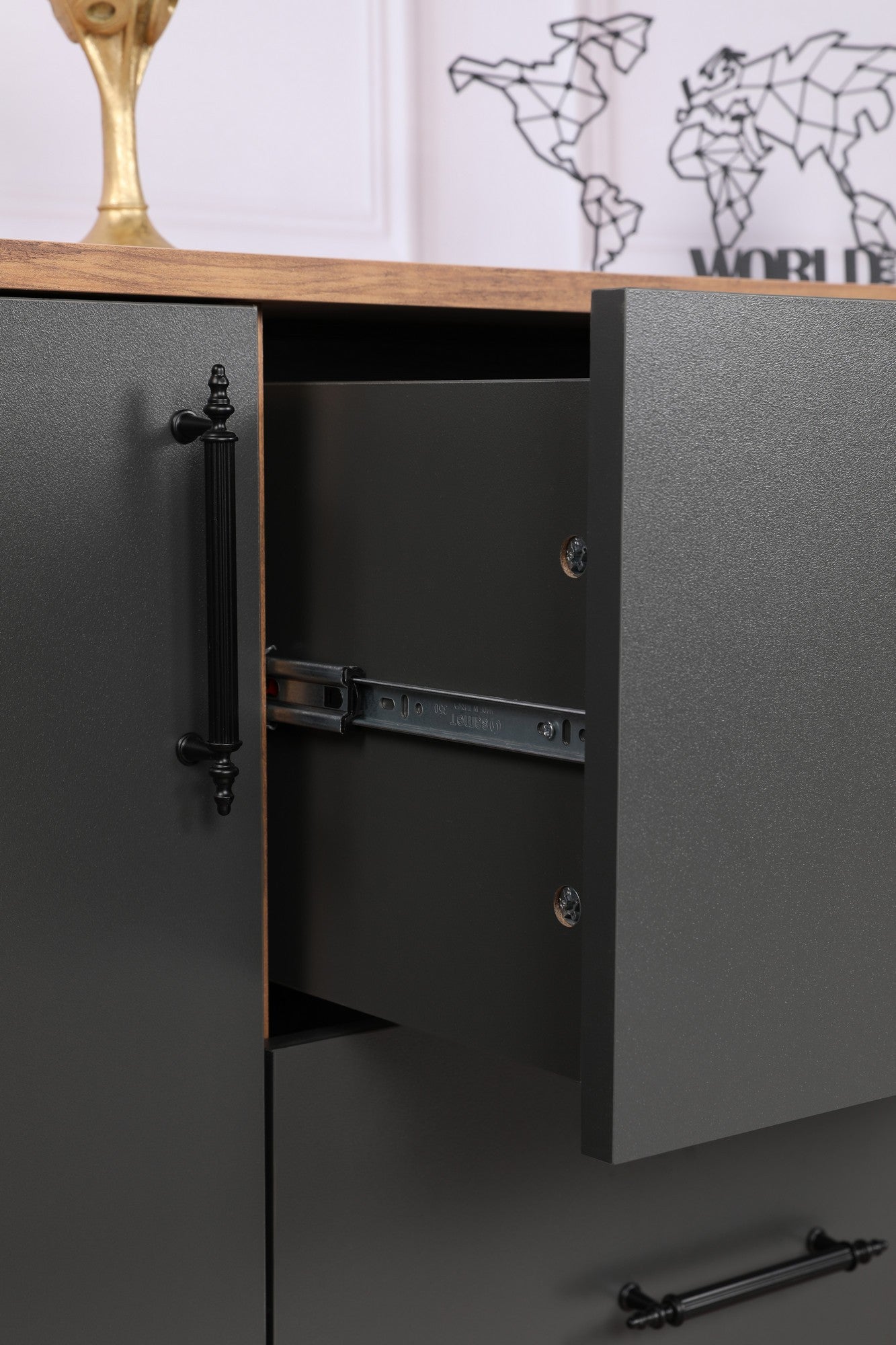 Avec son design épuré et sa combinaison de couleurs noyer et anthracite, notre console ajoute une touche de modernité à n'importe quel espace. Les pieds en bois apportent stabilité et élément naturel, tandis que les glissières télescopiques des tiroirs assurent une ouverture et une fermeture en douceur et sans effort.