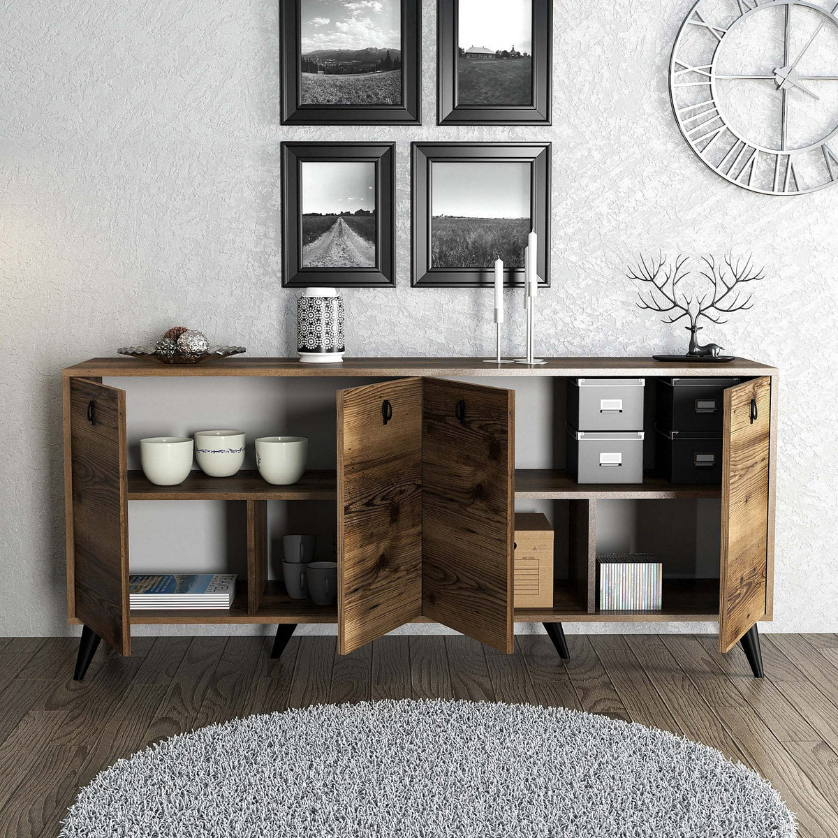Grâce à ses nombreuses étagères, notre console offre un vaste espace de rangement pour tous vos biens précieux. Exposez vos livres préférés, vos objets décoratifs ou vos photos de famille avec fierté.
