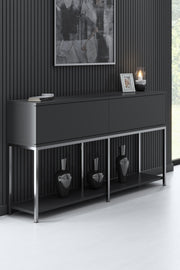 Avec une largeur de 150 cm, une hauteur de 80 cm et une profondeur de 30 cm, la console offre suffisamment d'espace pour ranger vos affaires sans encombrer votre pièce. La combinaison des couleurs anthracite et argent crée un contraste saisissant, faisant de cette console un point de mire dans n'importe quel environnement. Son revêtement en mélamine lui confère une finition lisse et brillante, ce qui rehausse son attrait visuel.