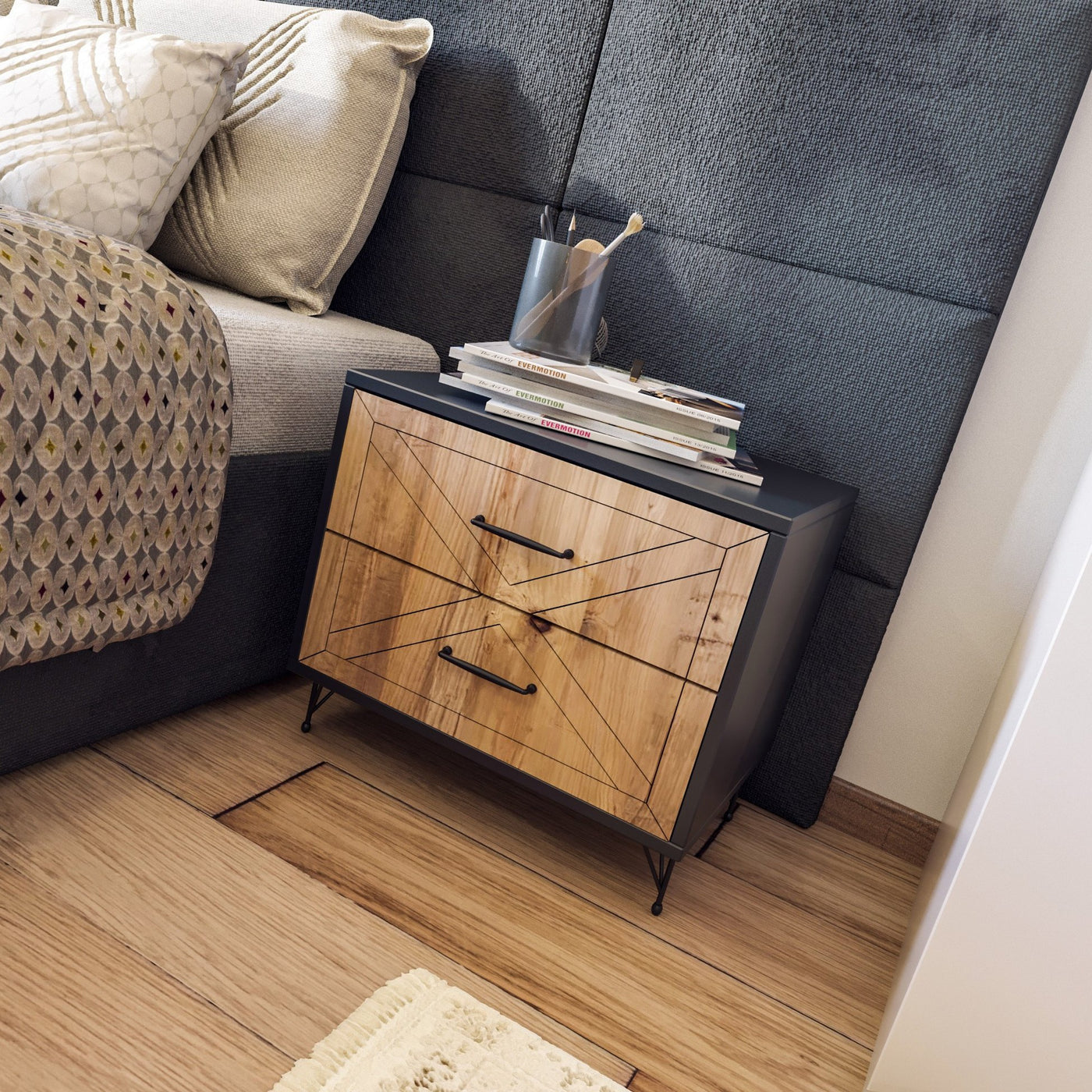Carte de particules à revêtement en mélamine 100%Épaisseur: 18 mmJambes en métalPortes de secours CNCDiapositives du tiroir télescopiqueLargeur: 50 cm Hauteur: 55 cm de profondeur: 40 cmHauteur de la jambe: 15 cm2 tiroirs