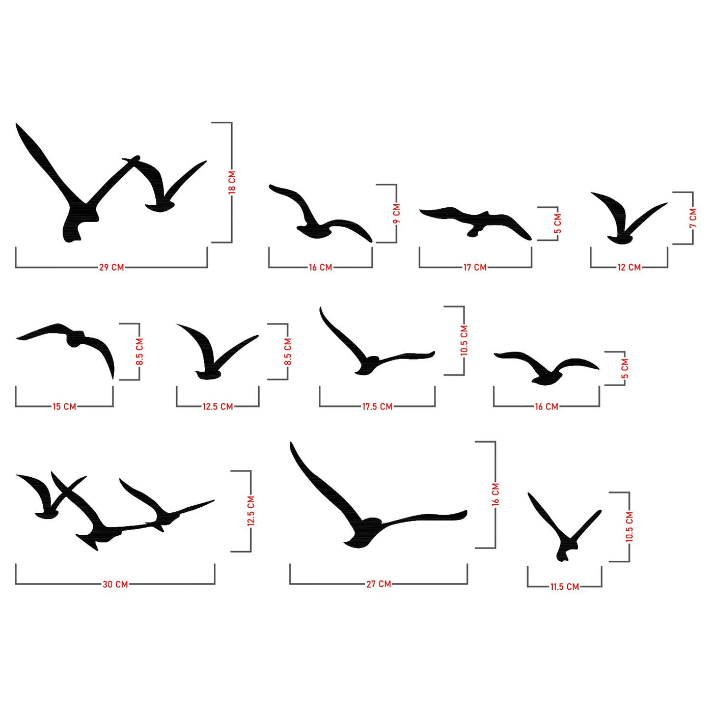 100% métal (épaisseur: 1,2 mm)Oiseau n ° 1: 29 x 18 cm (1 pièce)Oiseau n ° 2: 16 x 9 cm (1 pièce)Oiseau n ° 3: 17 x 5 cm (1 pièce)Bird n ° 4: 12 x 7 cm (1 pièce)Oiseau n ° 5: 15 x 8,5 cm (1 pièce)Bird n ° 6: 12,5 x 8,5 cm (1 pièce)Oiseau n ° 7: 17,5 x 10,5 cm (1 pièce)Oiseau n ° 8: 16 x 5 cm (1 pièce)Oiseau n ° 9: 30 x 12,5 cm (1 pièce)Oiseau n ° 10: 27 x 16 cm (1 pièce)Bird n ° 11: 11,5 x 10,5 cm (1 pièce)