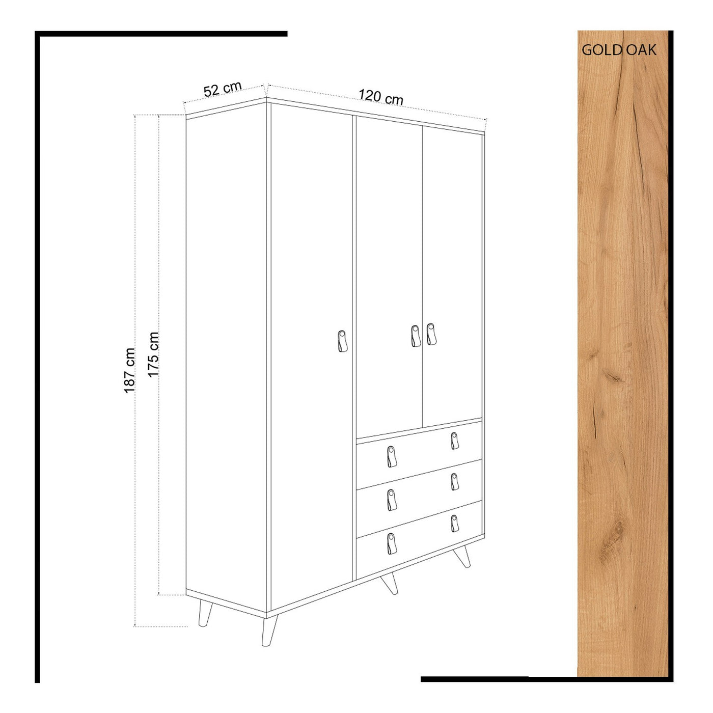 Avec une largeur de 120 cm, une hauteur de 187 cm et une profondeur de 52 cm, cette armoire offre un espace de rangement généreux pour toutes vos affaires. Les trois tiroirs offrent des options d'organisation pratiques, tandis que les nombreuses étagères vous permettent de ranger proprement vos vêtements, accessoires et autres.