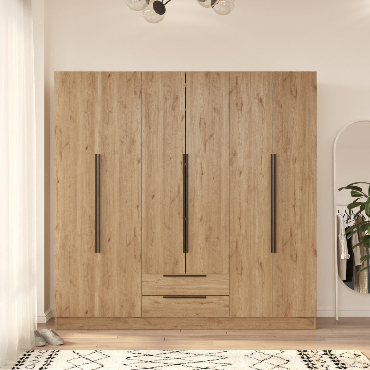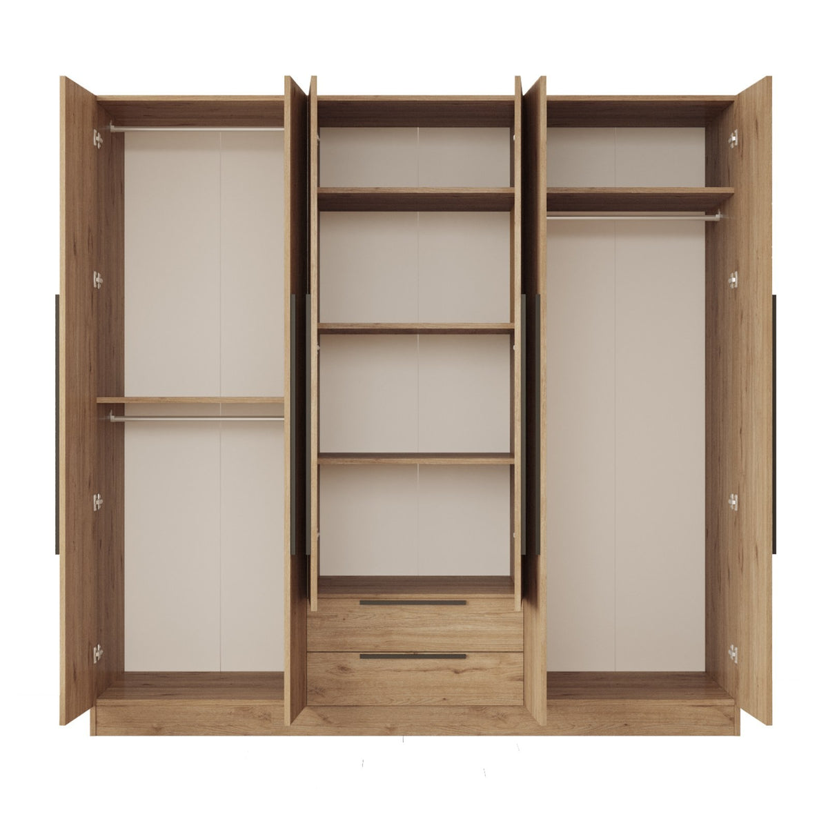 Avec une largeur de 210 cm, une hauteur de 212,5 cm et une profondeur de 55 cm, cette armoire offre un vaste espace de rangement pour toutes vos affaires. Elle comporte plusieurs étagères, tiroirs et rails de suspension, ce qui vous permet d'organiser soigneusement vos vêtements, accessoires et autres articles essentiels. Plus besoin de fouiller dans les piles de vêtements - tout aura sa place dans cette armoire.
