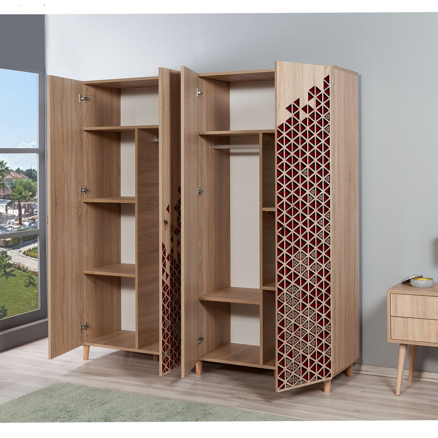 Armoire penderie 4 portes Infigo 180cm Bois Naturel Motif Triangle Bordeaux