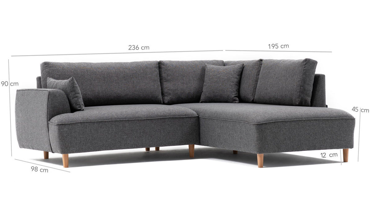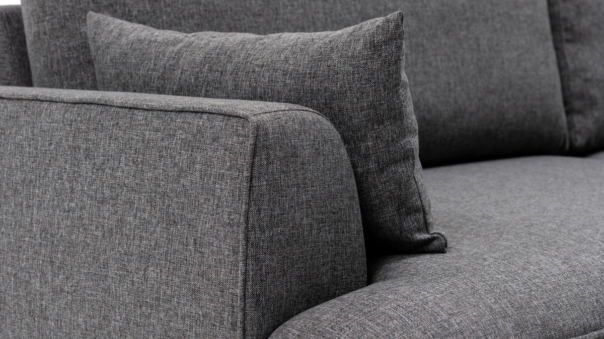 Élégant et polyvalent : avec son design épuré et sa couleur unie, notre canapé d'angle ajoute une touche de sophistication à tout espace de vie. Le tissu gris foncé s'harmonise avec tous les décors, ce qui en fait un choix polyvalent pour toute maison.