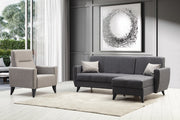 Avec son design élégant et moderne, notre ensemble de canapés ajoute une touche de sophistication à n'importe quel espace. La couleur gris foncé exsude l'élégance et la polyvalence, se fondant sans effort dans n'importe quel décor d'intérieur. Le canapé d'angle, avec ses dimensions généreuses de 218 cm de largeur, 86 cm de hauteur et 130 cm de profondeur, offre un grand espace d'assise pour toute la famille. Le fauteuil à oreilles, qui mesure 77 cm de largeur, 102 cm de hauteur et 80 cm de profondeur, constitue un endroit confortable où vous pouvez vous blottir avec un livre ou déguster une tasse de thé.