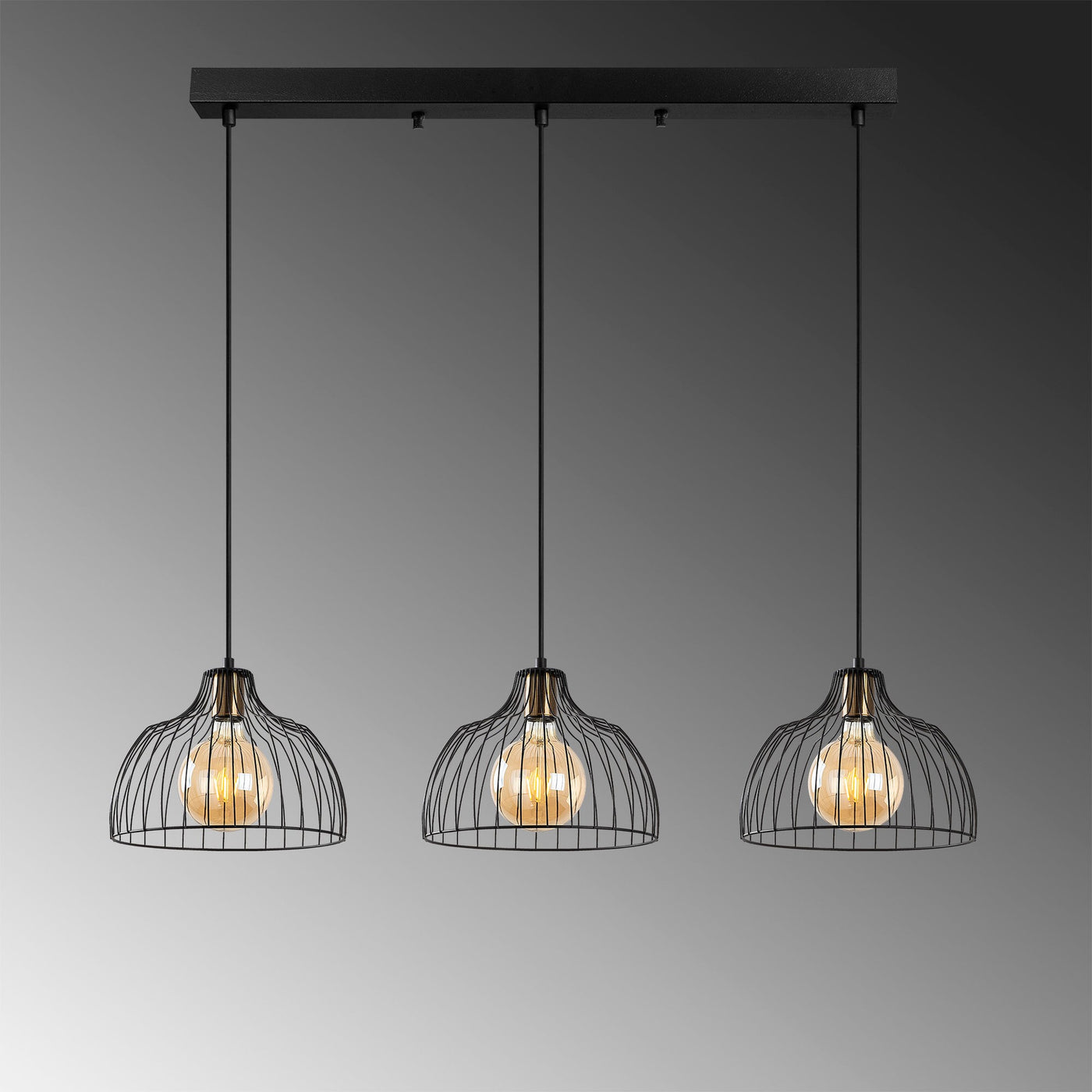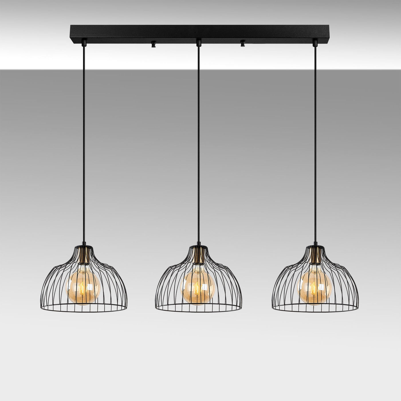 Corps métalliqueCasquette métalliquePlaque de base en métalCap (3 pièces)Diamètre de la casquette: 28 cmHauteur de la casquette: 30 cmTaille: 101 x 28 x 46-126 cmLongueur du câble: 120 cmHauteur réglableTaille de la plaque de base: 78 x 6 cmHauteur de la plaque de base: 3 cmIp20Type de socket: 3 x E27 max 40 W
