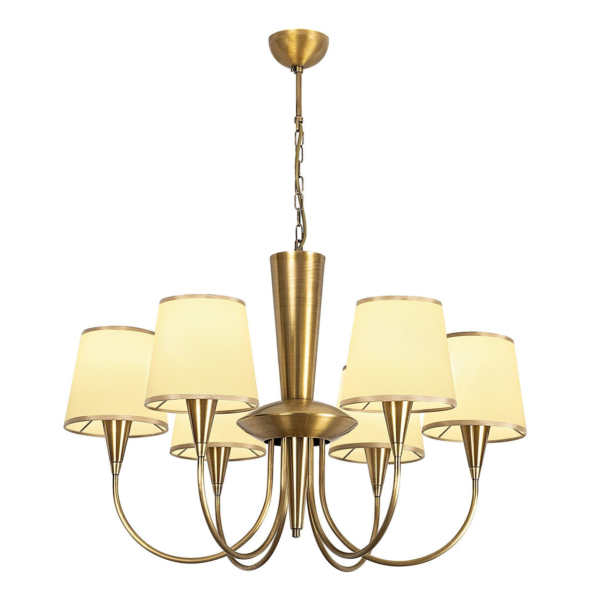 Corps métalliqueCapuchon de tissuDiamètre: 75 cmHauteur: 85 cmDiamètre de la casquette: 16 cmHauteur de la casquette: 15 cmType de socket: 6 x E 27 max 40 WDiamètre de la plaque de base: 10 cmHauteur de la plaque de base: 6 cmComprend des instructions de configuration et des appareils de connexionCode IP: IP20