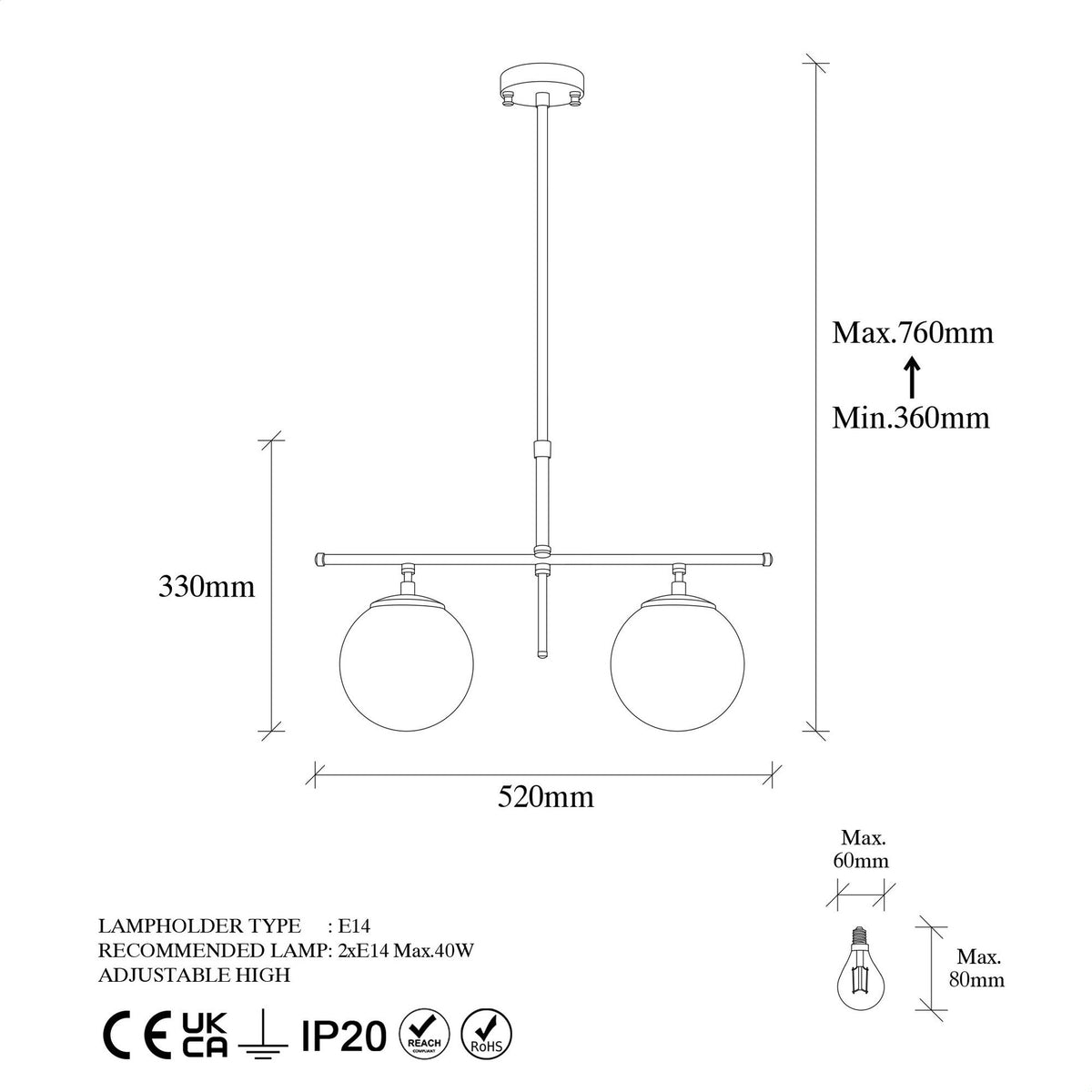 - Type de douille : 2 x E14 Max 40W