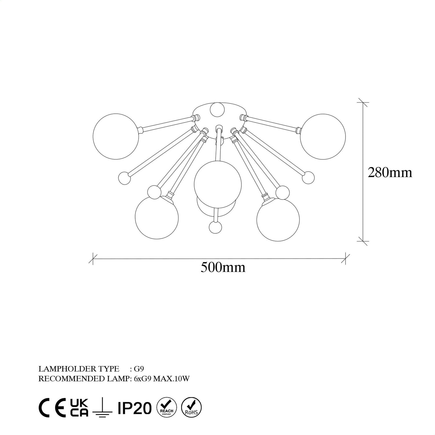Corps métalliqueCasquette de verreTaille: 50 x 50 x 28 cmDiamètre de la casquette: 10 cmL'ampoule n'est pas incluse220 - 240 VIp20Type de socket: 6 x G9 max 10 W