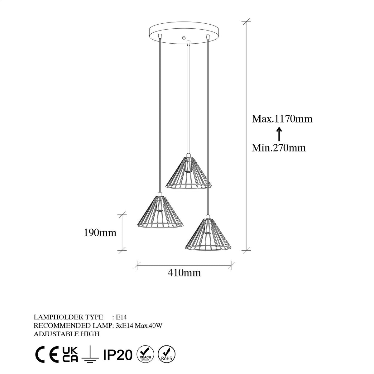 Corps métalliqueCasquette métalliqueDiamètre de la casquette: 20 cmHauteur de la casquette: 19 cmTaille: 41 x 41 x 117 cmDiamètre de la plaque de base: 30 cmHauteur de la plaque de base: 3 cmLongueur du câble: 90 cmIp20Type de socket: 3 x E27 max 40 WHauteur réglable