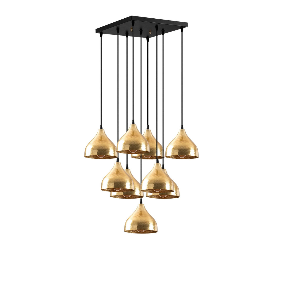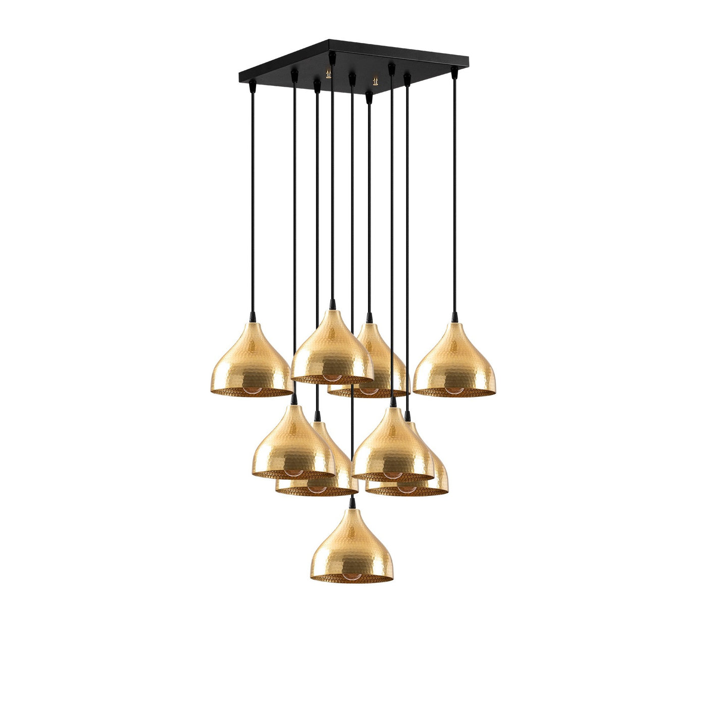 Corps métalliqueTaille: 63 x 63 cmHauteur: 114 cmDiamètre de la casquette: 18 cmHauteur de la casquette: 17 cmHauteur réglableTaille de la plaque de base: 50 x 50 x 3 cmLongueur du câble: 90 cmType de socket: 9 x E 27 max 40 WCode IP: IP20