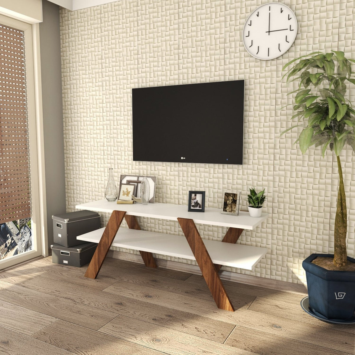 Avec une largeur de 120 cm, une hauteur de 45 cm et une profondeur de 33,1 cm, ce meuble TV offre suffisamment d'espace pour accueillir votre téléviseur, vos consoles de jeu et d'autres accessoires multimédias. Sa combinaison de couleurs blanc et noyer ajoute une touche d'élégance et de sophistication à tout espace de vie, ce qui en fait un complément polyvalent à toute décoration d'intérieur.