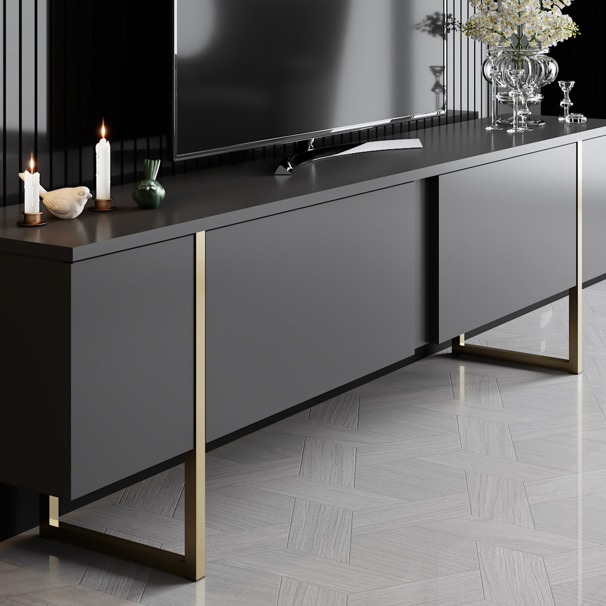 Élevez votre espace de vie avec le superbe meuble TV anthracite et or.
