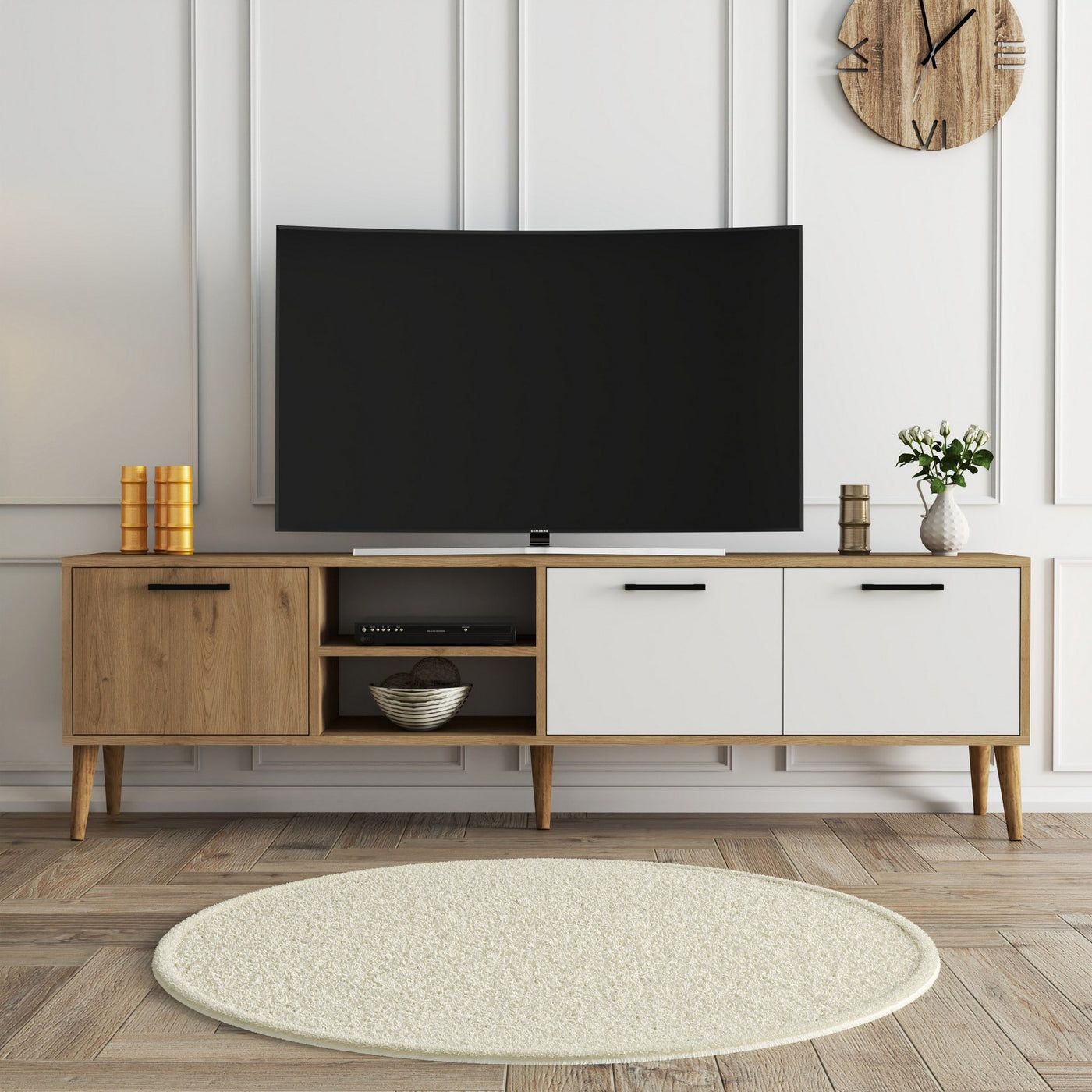 Doté d'un design épuré et moderne, notre meuble TV s'intègre sans effort à tous les styles d'intérieur, ajoutant une touche de sophistication à votre espace de vie. La combinaison des couleurs chêne et blanc crée un contraste étonnant qui attirera l'attention de vos invités et fera une déclaration audacieuse.