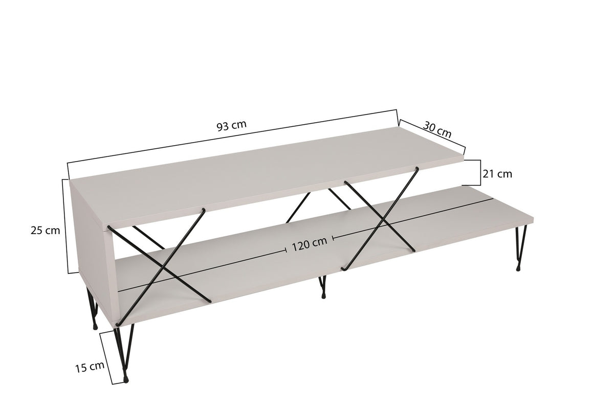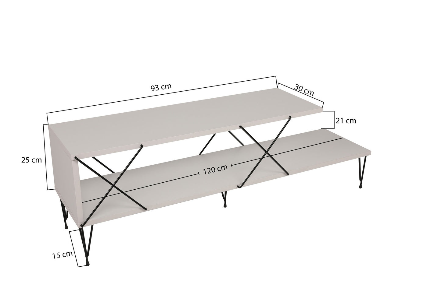 Carte de particules à revêtement en mélamine 100%Épaisseur: 18 mmPattes de ferLargeur: 120 cm Hauteur: 40 cm de profondeur: 30 cmDe nombreuses étagèresLongueur de l'étagère inférieure: 120 cmLongueur de l'étagère supérieure: 93 cmHauteur de la jambe: 15 cmDe nombreuses étagères