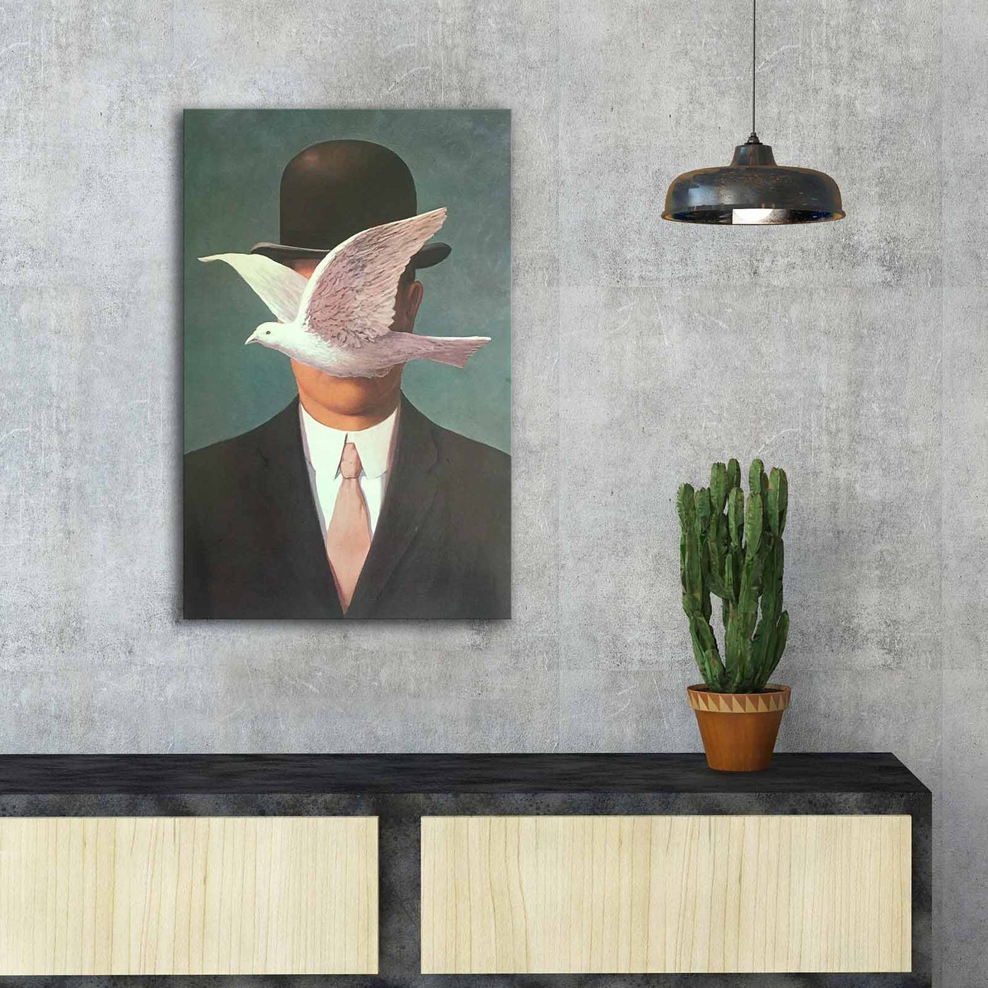 Laissez libre cours à votre imagination en plongeant dans les profondeurs de cette œuvre d'art qui suscite la réflexion. Le chapeau melon emblématique, symbole de conformité, juxtaposé à l'homme sans visage remet en question les normes sociétales et vous invite à vous interroger sur le sens de tout cela.