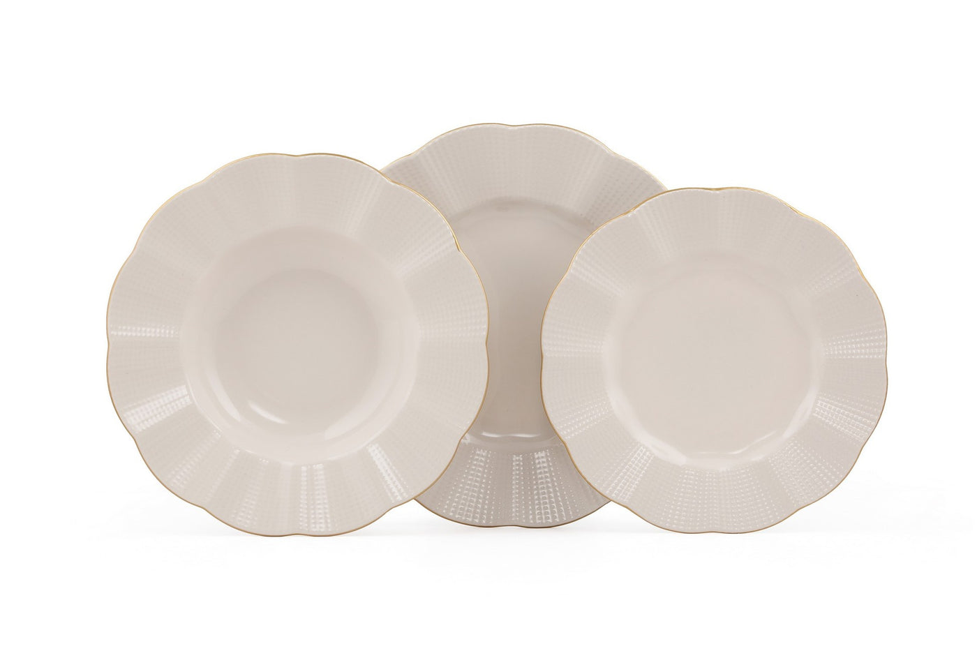 Le set comprend 6 assiettes de service, 6 assiettes et 6 assiettes à dessert, vous offrant tout ce dont vous avez besoin pour dresser une table complète et élégante. La combinaison des couleurs blanc et or ajoute une touche d'opulence, donnant à chaque repas l'impression d'être une occasion spéciale.