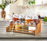 L'ensemble comprend également une superbe étagère de cuisine en bois, mesurant 32,5 x 17,5 x 13 cm. Fabriquée avec le plus grand soin, cette étagère ajoute une touche d'élégance à votre cuisine. La combinaison du bois et des couleurs transparentes crée une présentation visuellement attrayante qui impressionnera vos invités.