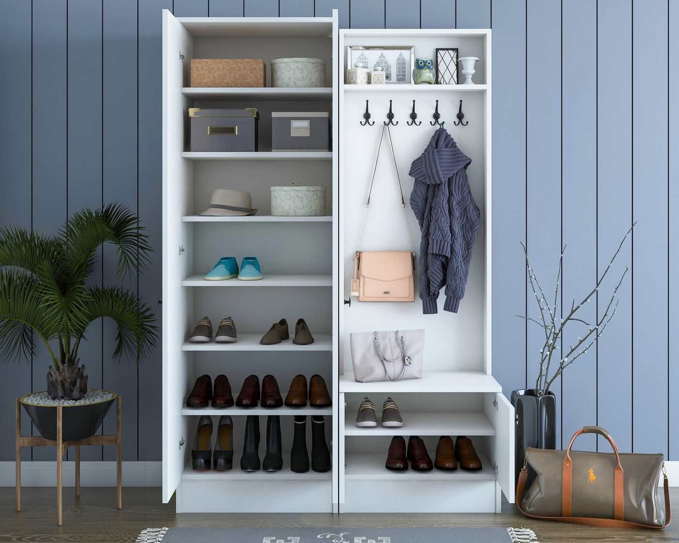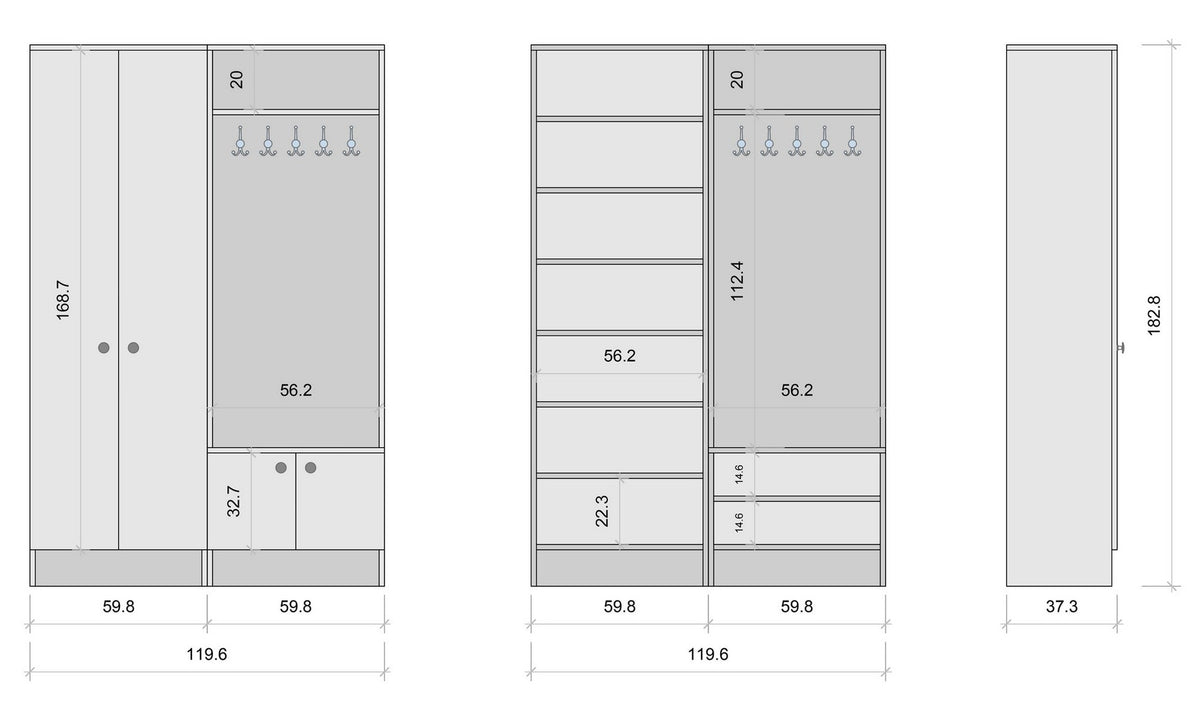 Carte de particules à revêtement en mélamine 100%Épaisseur: 18 mmLargeur: 119,6 cm Hauteur: 182,8 cm profondeur: 37,3 cm1 tiroirRack suspendu polyvalentDe nombreuses étagèresPeut être fixé au murStockage supplémentaire