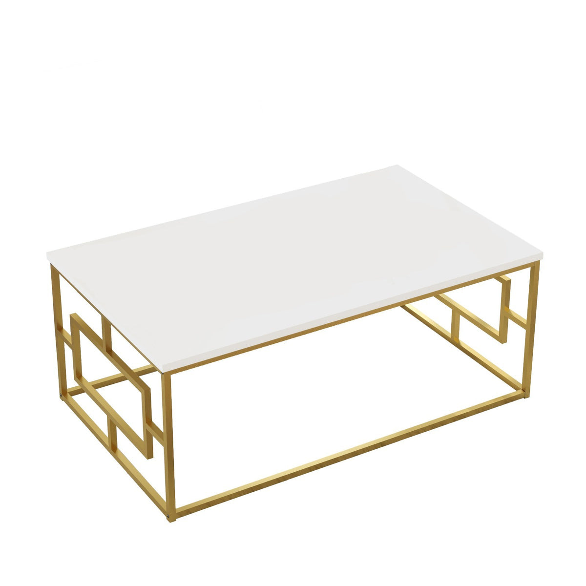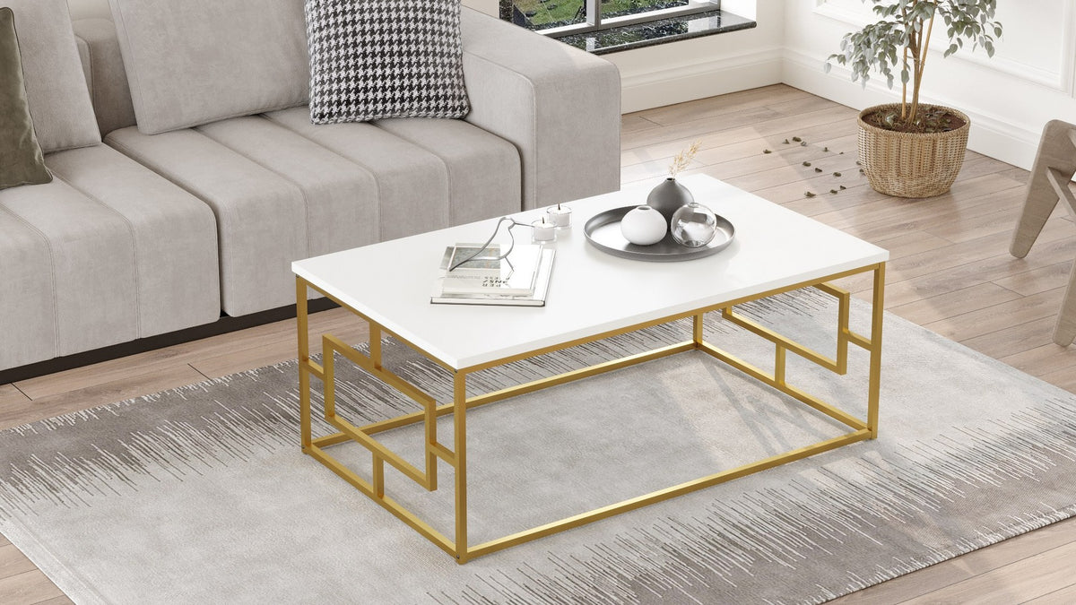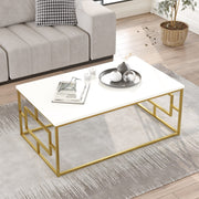 La table basse est dotée d'élégants pieds en métal qui ajoutent une touche de glamour à son design général. La combinaison des couleurs blanc et or crée un contraste saisissant, ce qui en fait une pièce de choix qui s'intègre sans effort à tous les styles de décoration intérieure.