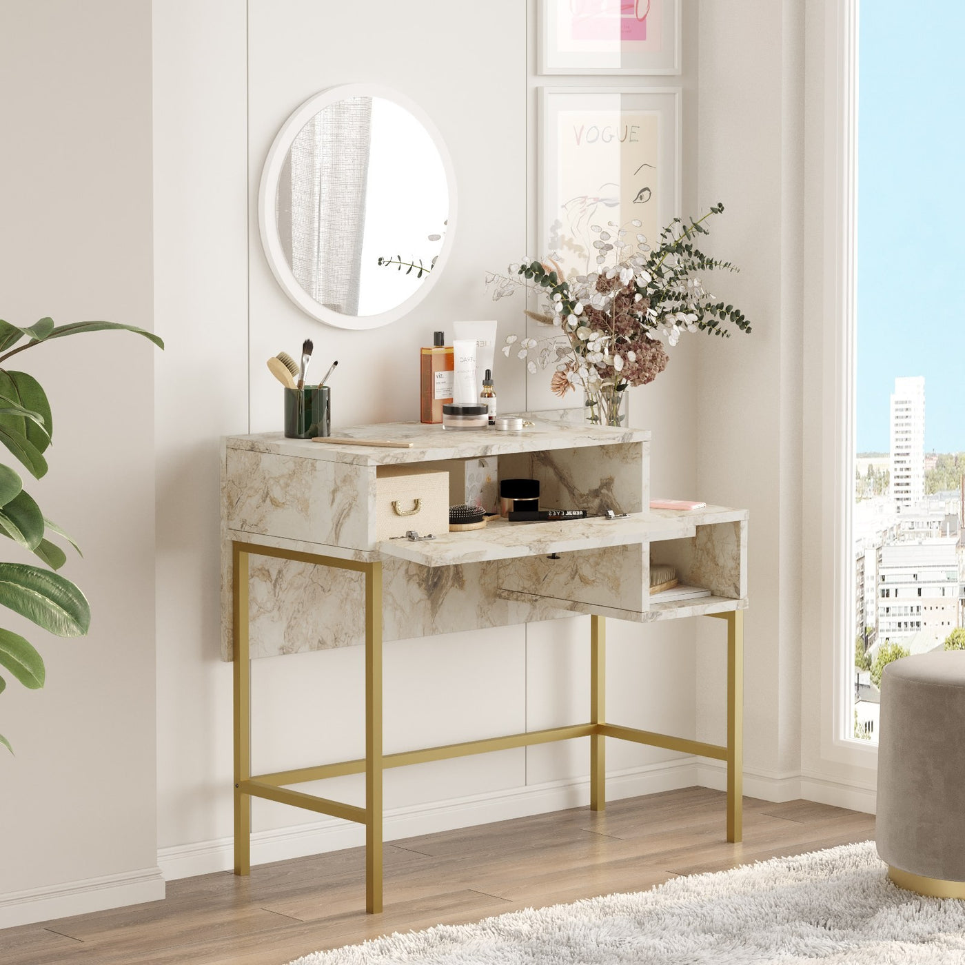 Dotée d'une magnifique combinaison de couleurs blanc et or, notre table de maquillage respire la sophistication et l'élégance. Les accents dorés ajoutent une touche de glamour, ce qui en fait une pièce de choix dans n'importe quelle pièce. Le plateau spacieux offre suffisamment d'espace pour tous vos accessoires de beauté, tandis que le miroir permet une application impeccable du maquillage.
