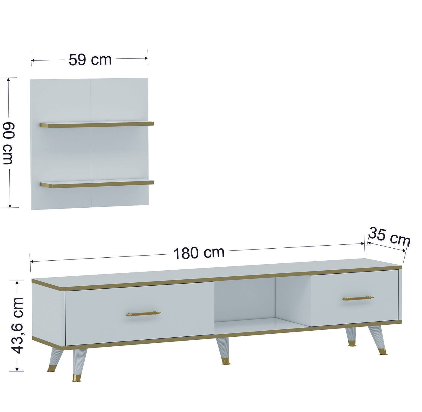 Carte de particules à revêtement en mélamine 100%Épaisseur: 18 mmTV Seck: Largeur: 180 cm Hauteur: 43,6 cm de profondeur: 35 cmÉTAPHE MURS Largeur: 59 cm Hauteur: 60 cm de profondeur: 18,5 cmDe nombreuses étagèresPattes en plastique