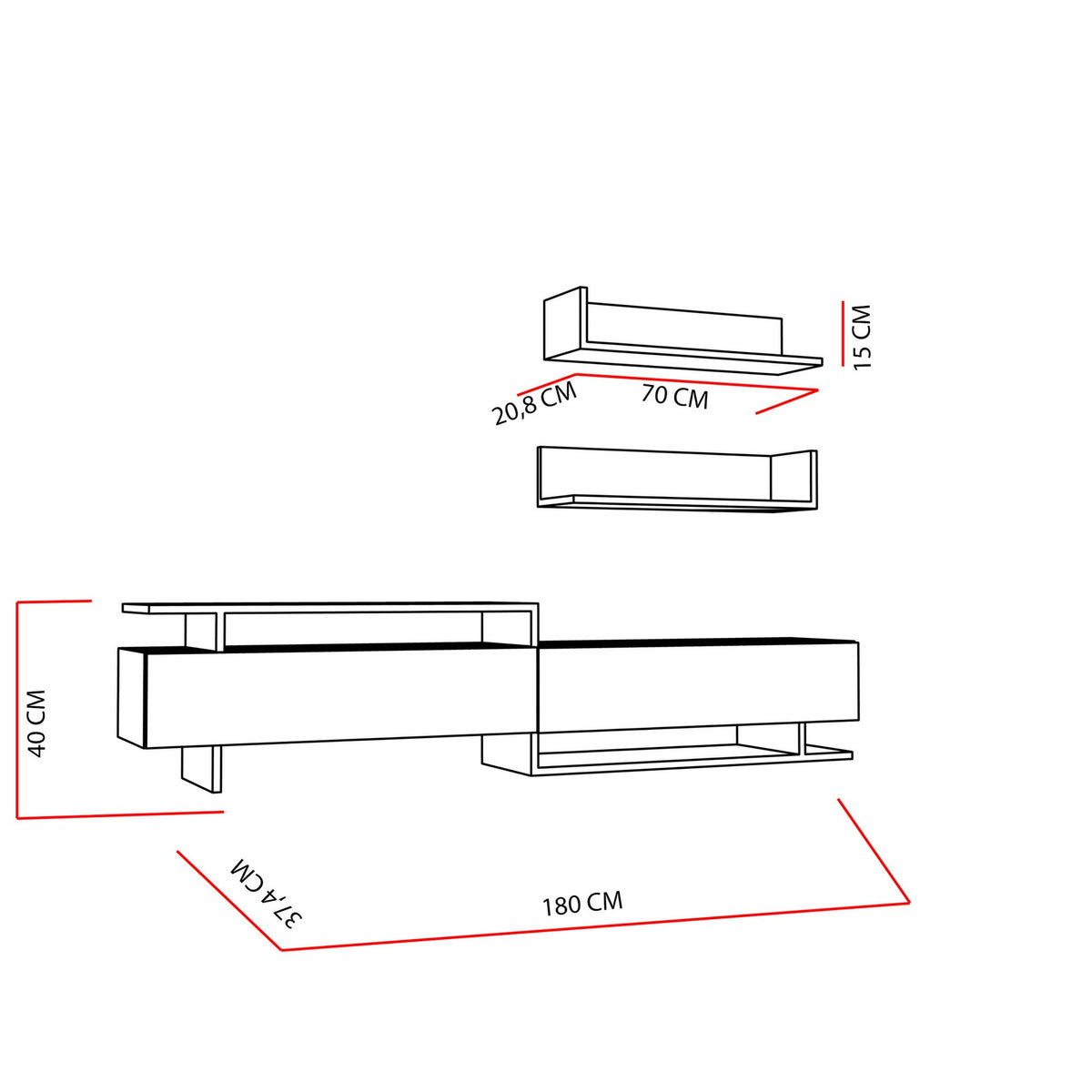 PANNEAUX DE PARTICULES ENDUITS DE MÉLAMINE 100 %Épaisseur : 18 mmDimensions du meuble TV : Largeur : 180 cm Hauteur : 40 cm Profondeur : 37,4 cmDimensions de l'étagère murale : Largeur : 70 cm Hauteur : 15 cm Profondeur : 20,8 cmDe nombreuses étagèresPeut être fixé au mur