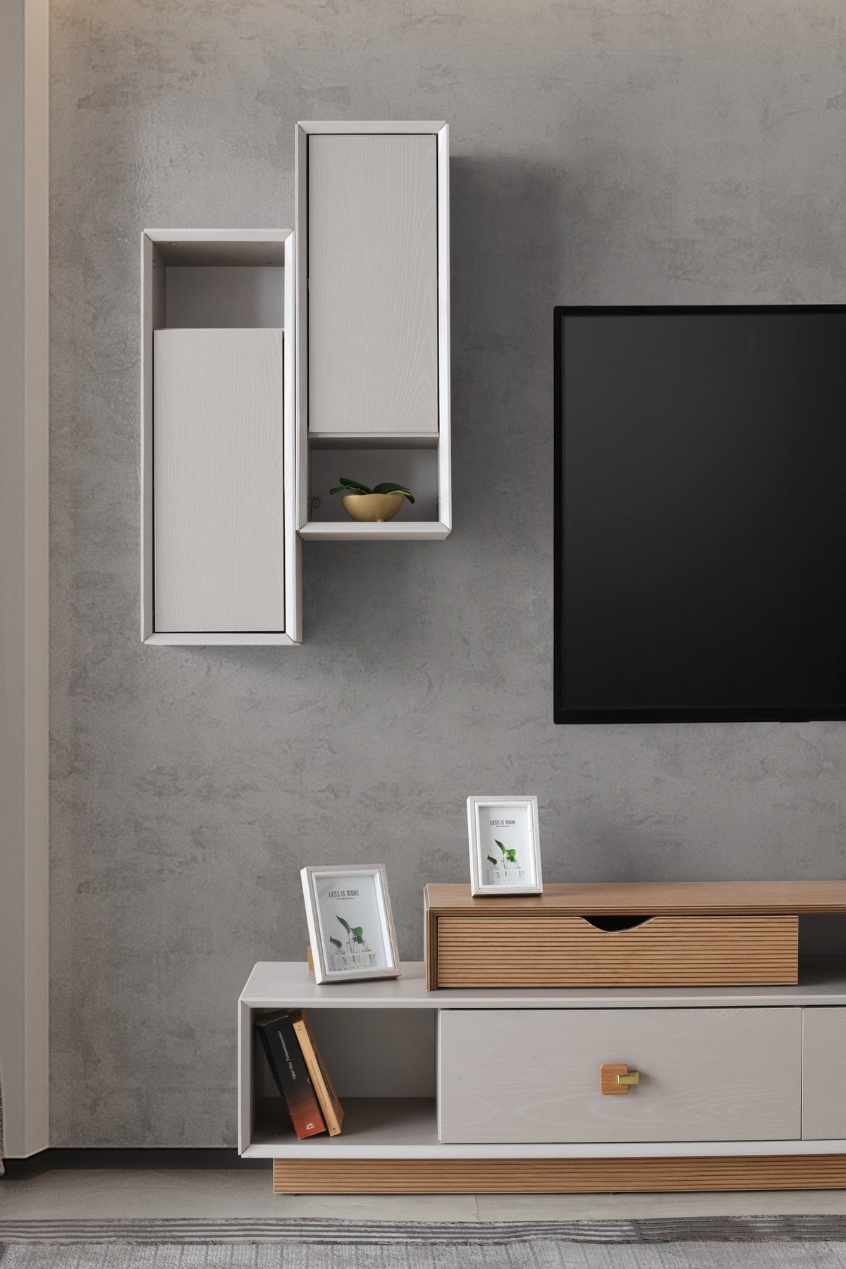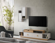 Ce meuble TV peut être facilement fixé au mur, ce qui lui confère une stabilité et une sécurité accrues. Ses dimensions compactes de 48 cm de hauteur et 35 cm de profondeur lui permettent de s'adapter aux espaces plus restreints, tout en offrant de nombreuses possibilités de rangement et d'affichage.