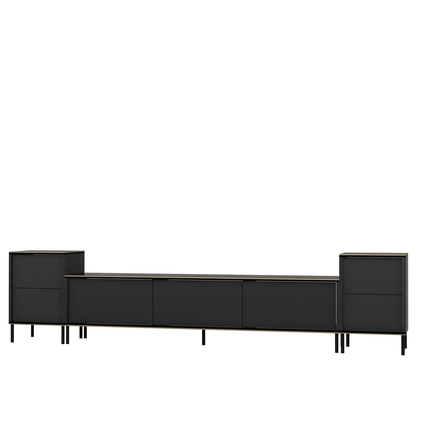Le meuble TV spacieux mesure 180 cm de largeur, 45,2 cm de hauteur et 35 cm de profondeur. Il permet de ranger facilement votre téléviseur et d'autres appareils multimédias. Les deux armoires, chacune mesurant 40 cm de largeur, 60 cm de hauteur et 35 cm de profondeur, offrent un vaste espace de rangement pour vos DVD, vos consoles de jeu et bien d'autres choses encore. Les nombreuses étagères vous permettent d'organiser soigneusement vos affaires et de garder votre espace de vie libre de tout encombrement.