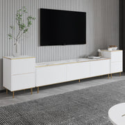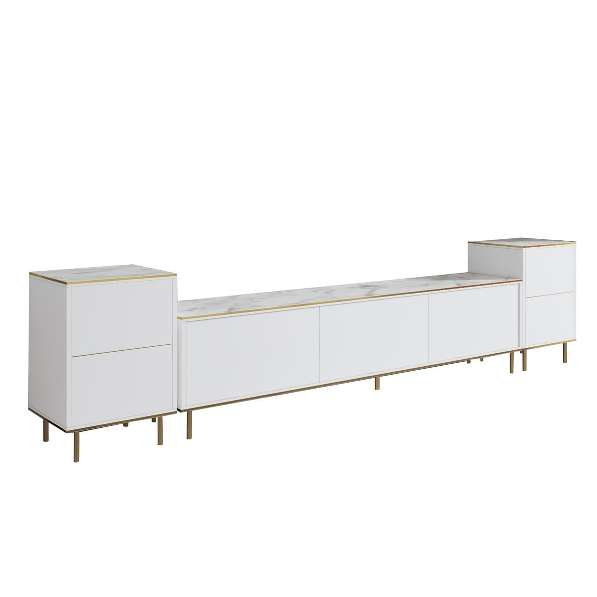 Fabriqué avec la plus grande précision et le souci du détail, notre meuble TV est conçu pour ajouter une touche de sophistication à votre intérieur. La combinaison du marbre blanc et des couleurs dorées exsude l'opulence, ce qui en fait une pièce de choix qui impressionnera vos invités.