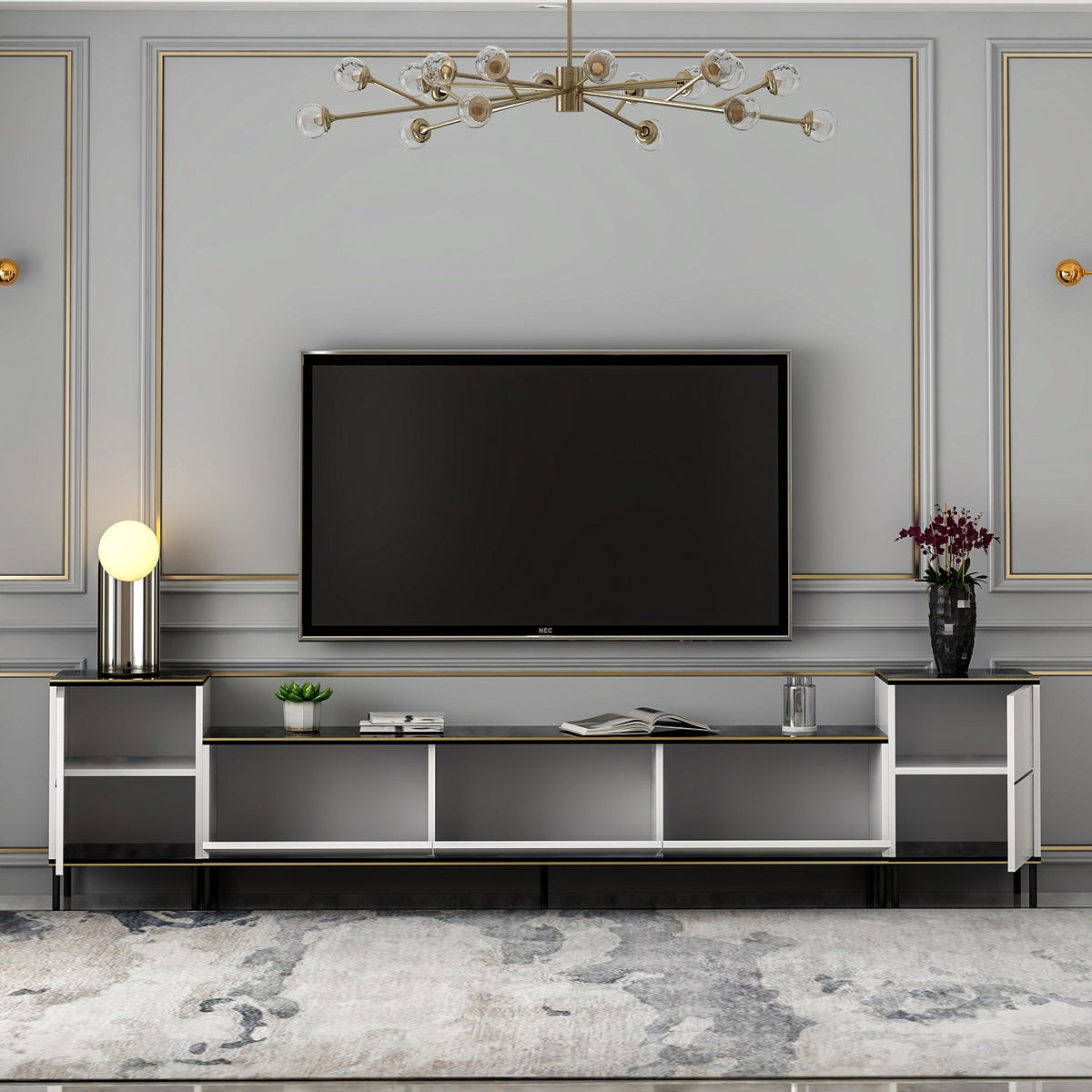 - Dimensions du meuble TV : Largeur : 180 cm, Hauteur : 45.2 cm, Profondeur : 35 cm